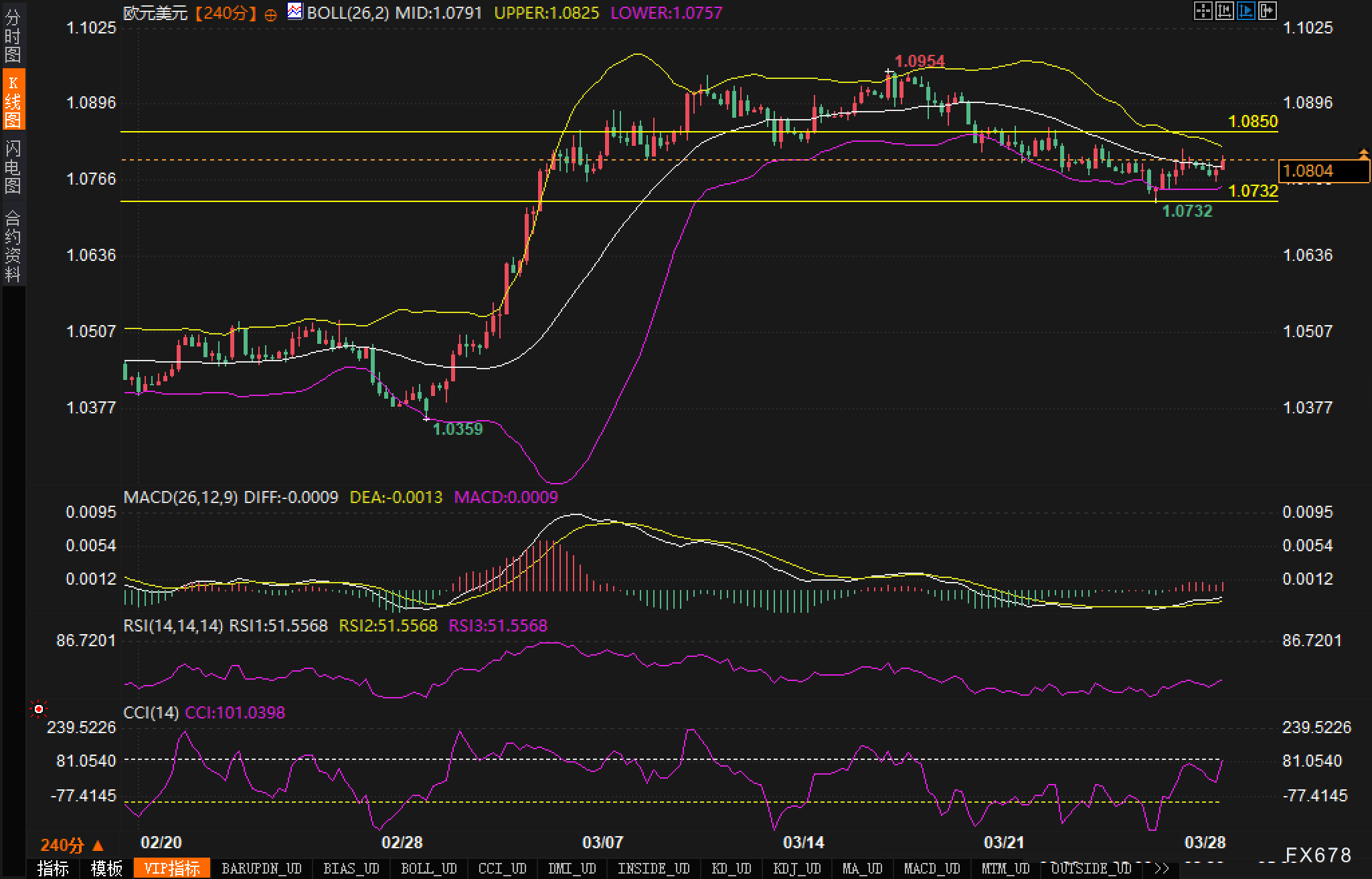 从240分钟图来看,欧元兑美元在前期高点受阻后逐渐回落,当前围绕布林带中轨与下轨之间震荡。布林带上轨约在1.0825,中轨1.0791,下轨则在1.0757附近,整体带口略有收敛,暗示短线波动或加剧。MACD双线靠近零轴附近,红柱动能微弱,显示多空较量胶着;RSI在50-55区间波动,尚未进入极端超买或超卖区域。下方1.0732区域在前期曾提供支撑,若该位置失守,汇价或进一步下探1.0700乃至更深的回调空间。而上方初步阻力关注1.0850,如若站上该水平,才有望测试1.0890一线。
