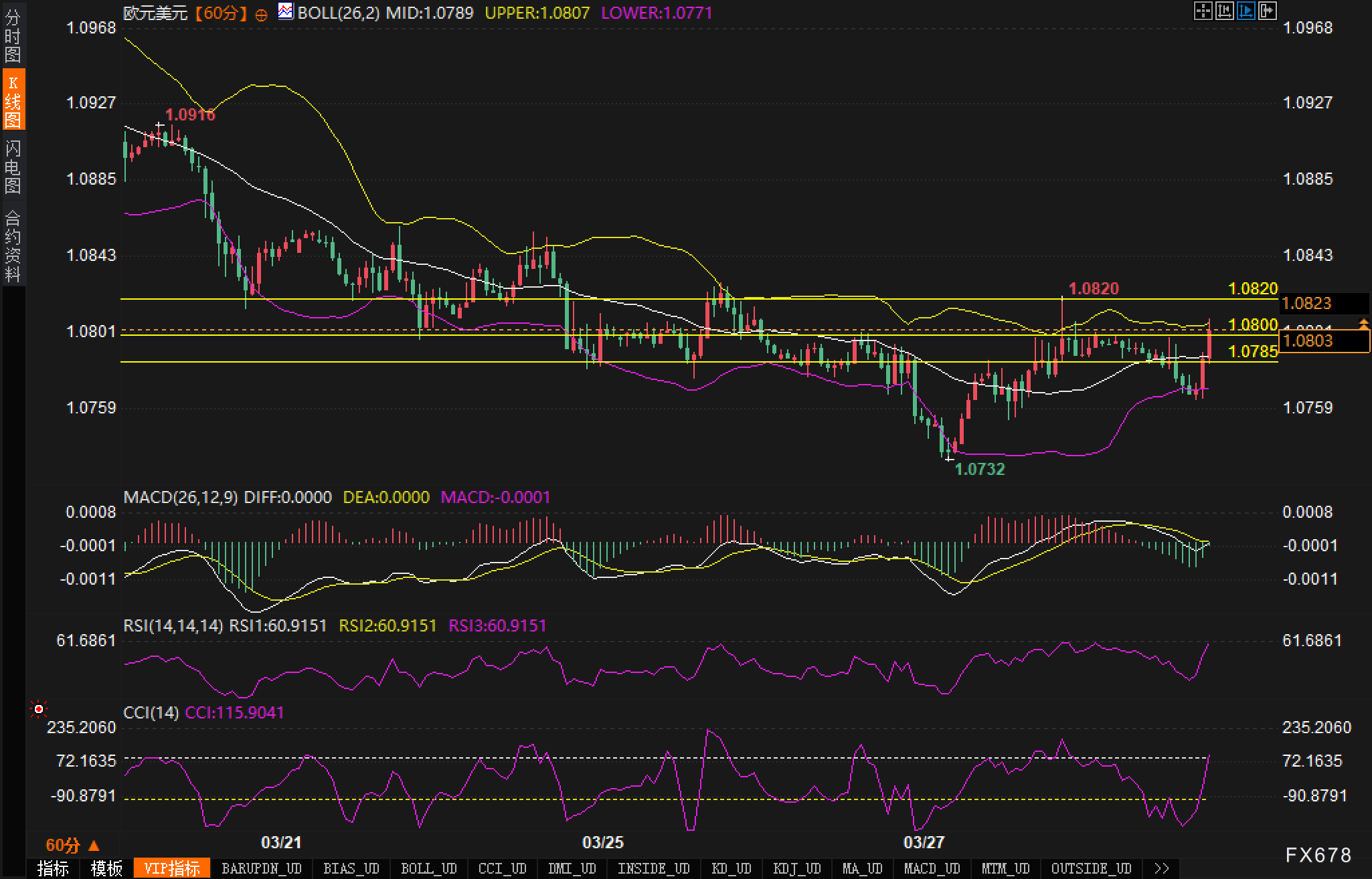 在60分钟图中,布林带上轨约在1.0807,下轨在1.0771,中轨则在1.0789附近,近期K线在中轨下方运行,说明短线空头略占优势。MACD在零轴附近反复穿越,动能柱时正时负,表明行情短期缺乏明确方向指引;不过当前短线RSI已经超过60,若欧元兑美元能站稳1.0810上方,并突破1.0820-1.0830阻力区,后续将有机会向1.0850乃至更高水平迈进。相反,若再次跌破1.0765,则需警惕进一步走弱风险。