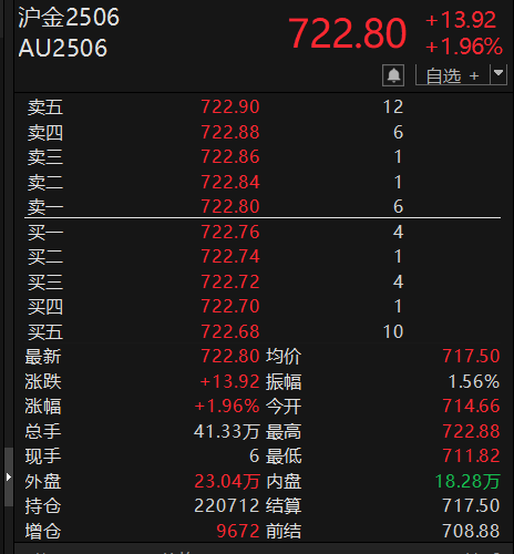 沪金2506合约盘中最高触及722.88元/克,截至下午收盘涨1.96%,报722.8元/克,均创下历史新高。