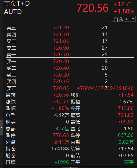 国内方面,黄金T+D盘中一度突破720元/克,截至下午收盘涨1.8%,报720.56元/克。