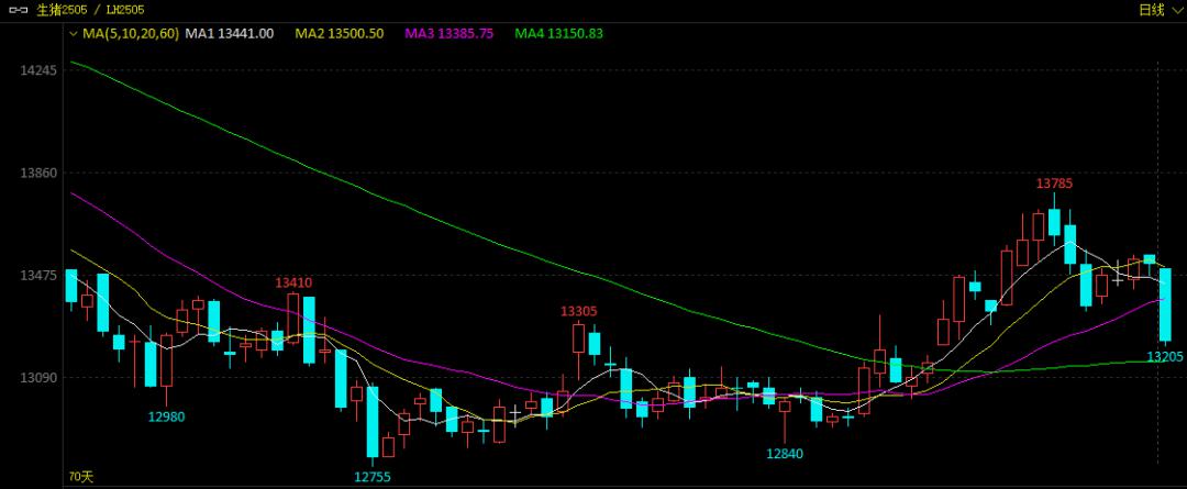 上周,生猪期货价格先扬后抑,主力合约2505在周五下跌超2%,盘中最低跌至13205元/吨,创近三周最低。
