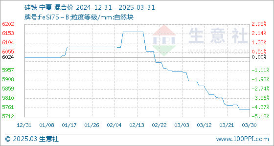 3月31日,生意社硅铁基准价为5752.86元/吨,与本月初(5954.29元/吨)相比,下降了-3.38%。