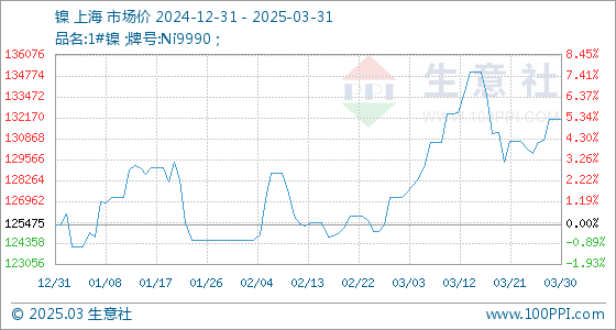 3月31日,生意社镍基准价为132066.67元/吨,与本月初(127216.67元/吨)相比,上涨了3.81%。