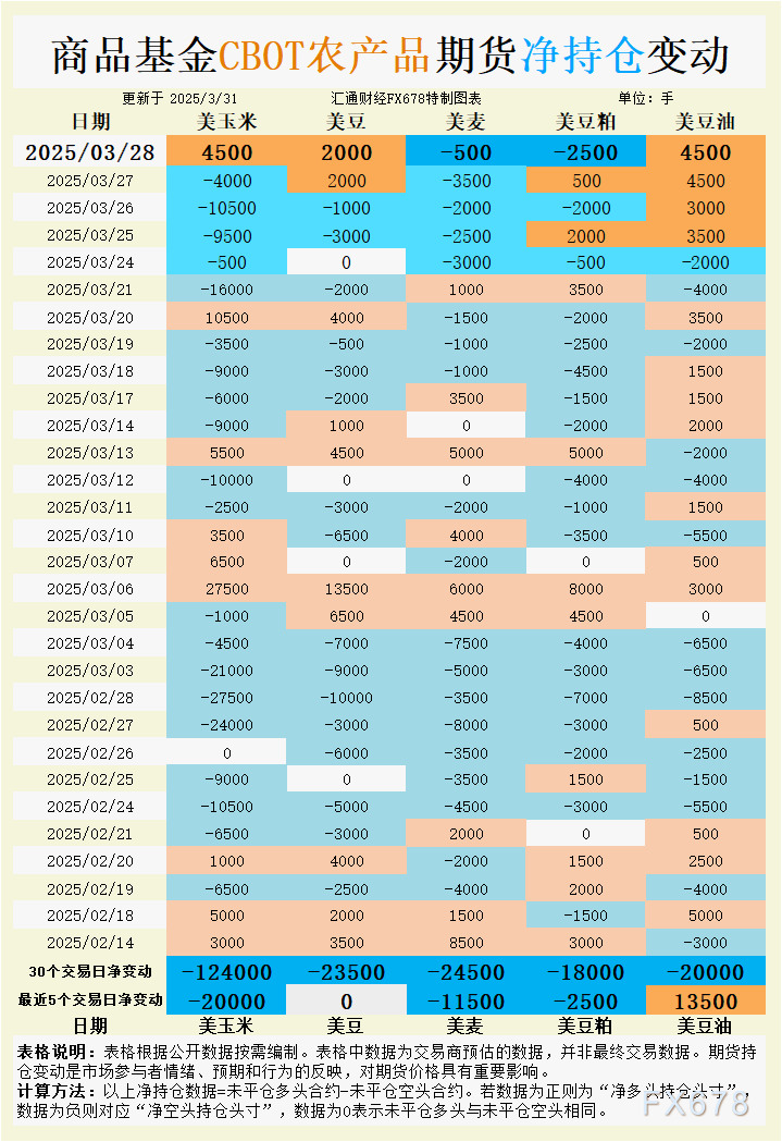 汇通财经APP讯——上周五(3月28日),CBOT谷物期货市场在关键政策窗口前呈现分化走势。玉米、大豆及豆油受基金空头回补推动反弹,而小麦和豆粕则因出口疲软及南美供应压力延续跌势。截至上周收盘,市场焦点已转向本周即将公布的USDA种植意向报告和季度库存数据,叠加特朗普关税言论引发的贸易政策不确定性,多空双方持仓结构调整显著。