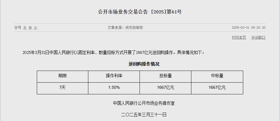 人民银行3月31日公告称,2025年3月31日中国人民银行以固定利率、数量招标方式开展了1667亿元逆回购操作,操作利率为1.50%,与此前持平。因今日有1350亿元7天期逆回购到期,当日实现净投放317亿元。