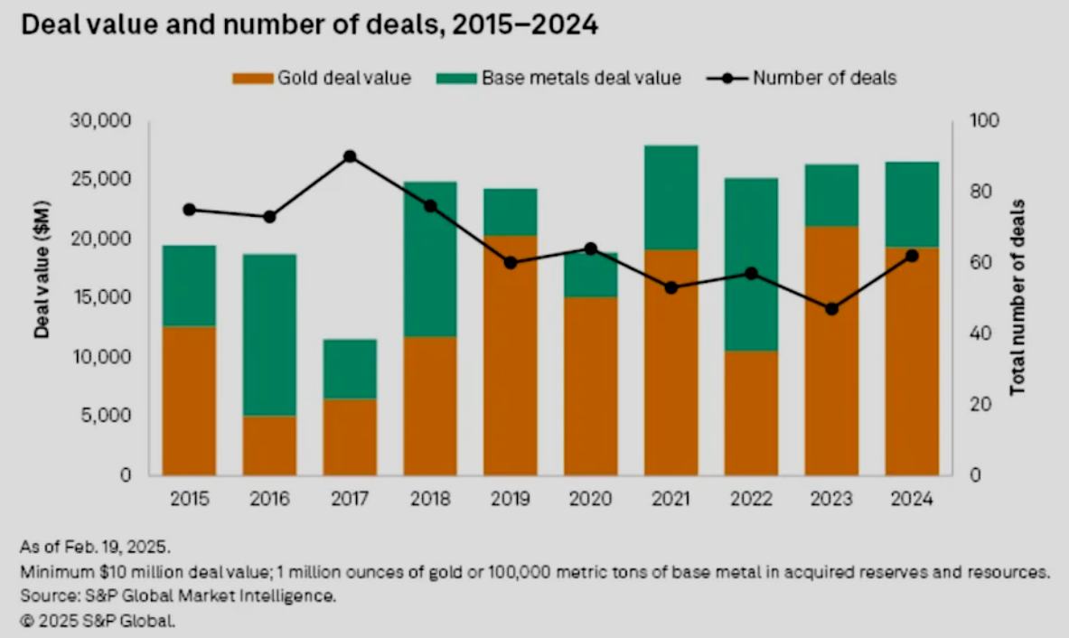 首先,并购活动蓬勃发展,这往往是市场高峰期的情况。标普全球市场情报的数据显示,2024年黄金行业的交易量同比增长32%。