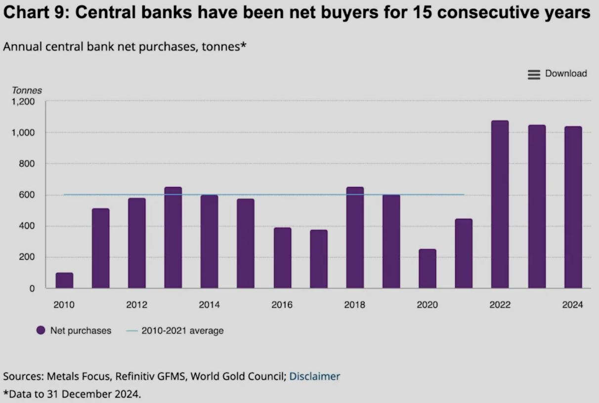 2024年,全球央行将净购买1045吨黄金,这是连续第三年购买量超过1000吨。