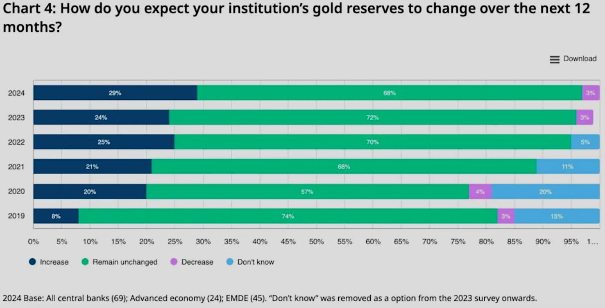但有迹象表明,全球对黄金的需求正在开始减弱。世界黄金协会去年进行的一项调查显示,71%的央行表示,预计未来12个月本国的黄金储备将保持不变或减少。
