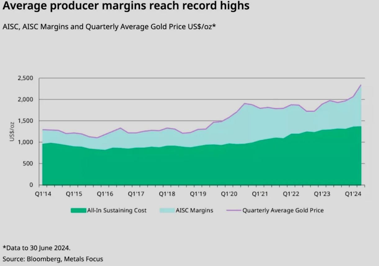米尔斯指出,高金价刺激生产商持续增产,但供应增加将在未来几年对价格形成下行压力。世界黄金协会数据显示,近年来黄金开采利润持续攀升。2024年第二季度金矿商平均利润率达到每盎司950美元,创2012年以来最赚钱的采矿周期。