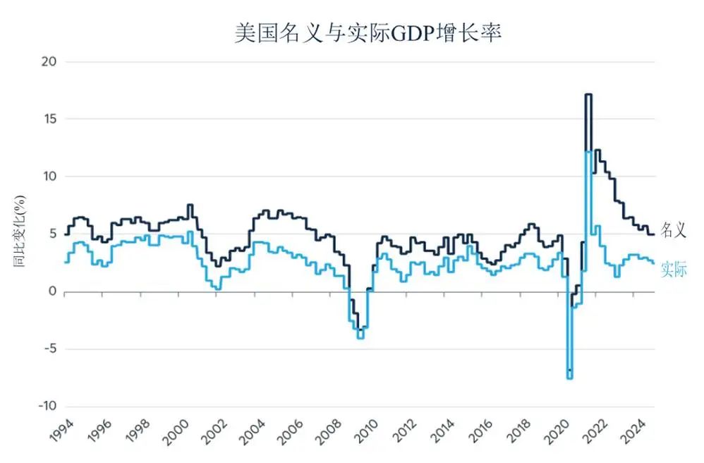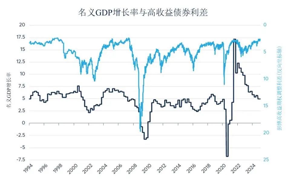 由于名义GDP数据仅在季度结束后才会公布,这可能给投资者的决策带来挑战。此外,信贷产品投资者通常会略微提前预判实际GDP和名义GDP的变化趋势。信用利差扩大实际上可能会引发经济下行,因为这会使企业融资渠道受阻,进而迫使其通过推迟投资、削减开支和裁员等方式来应对不断恶化的财务状况。从这一视角来看,当前信用利差的收窄态势可能预示着未来数月的经济增长将继续保持稳健。