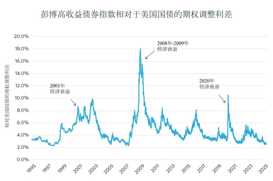 但是,一旦名义GDP增速放缓,利差可能会大幅扩大。例如,在科技泡沫破裂引发的经济衰退期间,美国名义GDP增速从5-7%放缓至2-2.5%。这足以推动彭博高收益债券相对于美国国债的期权调整利差从1990年代末的不足3%飙升至2002年的约10%。