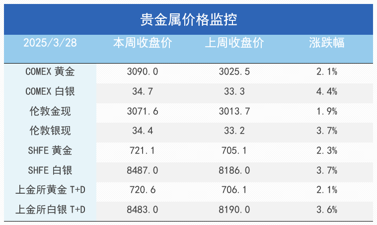 上周金价再创新高,COMEX金银于3036-3124美元/盎司、33.3-35.5美元/盎司区间内运行。上周特朗普宣布对进口汽车加征25%关税,同时临近4月2日特朗普加征对等关税时点,市场加剧担忧关税及更多不确定性政策,避险需求推升金价再度创下历史新高。