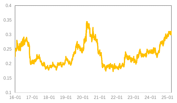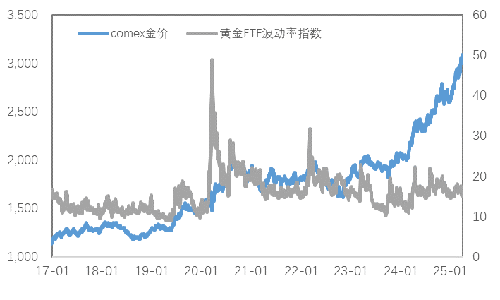 黄金VIX处于低位,近期市场风险偏好回升,黄金波动率相对偏弱运行。