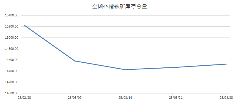 库存方面,截至3月38日,全国45个港口进口铁矿库存为14520.4万吨,周环比增加57.91万吨,月环比减少701万吨;日均疏港量为313.21万吨,周环比增加10.6万吨,月环比增加14.38吨;在港船舶数85条,与2月底相比增加28条。上周铁矿港口库存情况如上图;全国钢厂进口铁矿库存总量为9110.45万吨,月环比减少56.74万吨。3月以来随着钢厂高炉复产不断,开工规模维持在一定规模,使得钢厂提货需求增加,所以日疏港量增长。更因为3月海外发运量受天气因素影响整体大幅缩减,再加上钢厂复产后不断消耗,港口库存转向去库化。现阶段钢铁后续行情还是要看下游钢材成交情况,如果4月钢材市场仍能维持旺季行情,成交量好转,钢厂铁矿需求释放韧性可期,铁矿港口库存有去库可能。