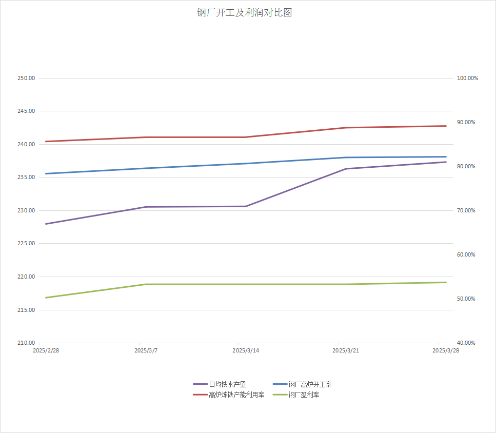 需求方面,3月钢厂高炉开工整体情况保持稳中有涨,主要在于钢厂利润相对稳定,生产积极性较好,铁水产量维持高位。3月起随着下游开工情况良好,钢材成交情况好转。短期内钢厂利润尚可支撑现有生产规模,从去年的铁水产量情况以及钢厂利润情况来看,如果钢厂利润支撑尚可,那么铁水产量会有增长可能,但具体增加情况还要看钢厂利润情况以及下游钢材成交情况,4月初铁矿需求或小幅增长。