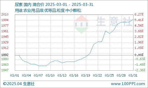 据生意社商品行情分析系统,截止3月31日,国内尿素市场参考均价为1997元/吨,较3月1日参考均价1892元/吨,国内尿素市场价格上涨幅度为5.55%。