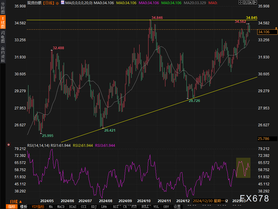 未来一周,白银走势将取决于两大变量:一是美国关税政策的具体范围与执行力度。若措施超出市场预期,避险情绪与通胀担忧的双重驱动可能推升白银突破34.87美元阻力,甚至测试去年高点36.50美元区域;反之,若政策力度温和,白银或回落测试32.77美元支撑。