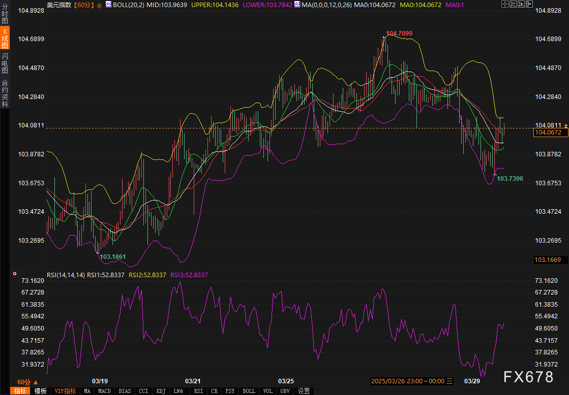 从60分钟图来看,美元指数当前运行于布林带中轨(103.9642)附近,上轨与下轨分别位于104.144和103.7841,价格波动区间收窄至0.36点以内。短期均线系统(12周期与26周期)呈现缠绕状态,表明多空力量暂时均衡;RSI指标(47.82)接近中位线,进一步印证震荡特征。