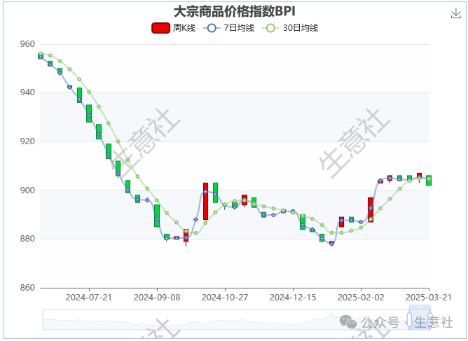 3月21日大宗商品价格指数BPI为902点,较周初下降了4点,较周期内最高点1343点(2021-10-19)下降了32.84%,较年内最低点877点(2025-01-07)上涨了2.85%。