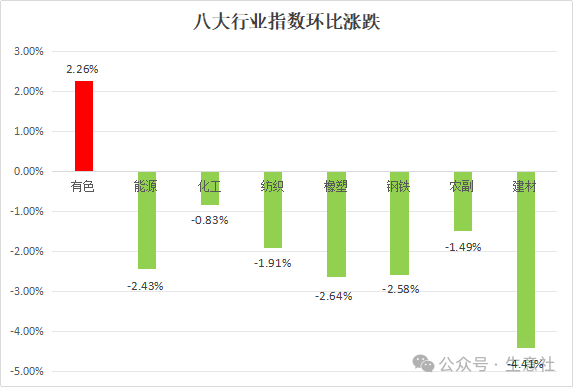 个行业,本周跌多涨少,上涨的仅有色行业,涨幅为0.08%;下跌前三的分别是建材行业,跌幅为-1.04%,农副行业,跌幅为-0.80%,钢铁行业,跌幅为-0.80%。
