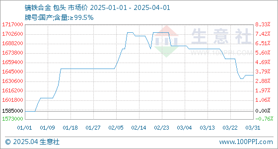 4月1日,生意社镝铁合金基准价为1640000.00元/吨,与上月初(1685000.00元/吨)相比,下降了-2.67%。