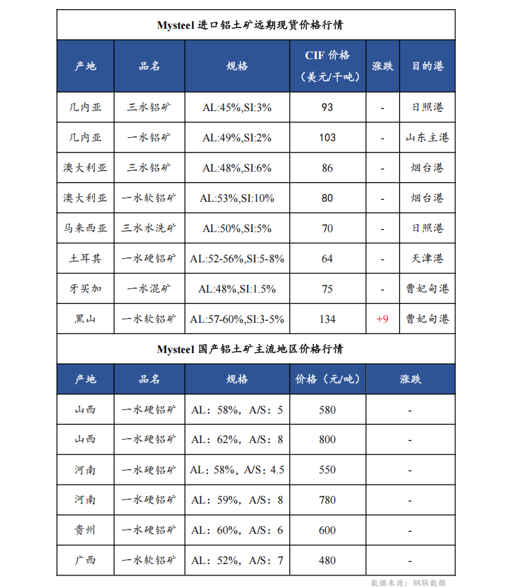 3月28日铝土矿非主流来源国矿石价格受到成交驱动有小幅上涨,侧面证明由于国产矿的放开暂时没有落地,因此国内氧化铝厂对于 高温矿的需求阶段性存在。其余主流矿石本周成交稀少,预计清明节假期期间及以后有部分海漂现货到港,但截至目前还未成交。
