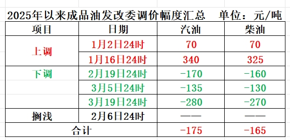 2025年以来,国内成品油零售限价已经历六轮调整,分别为“两涨三跌一搁浅”。调价后,国内汽、柴油价格每吨较去年底分别累计下跌175元、165元。