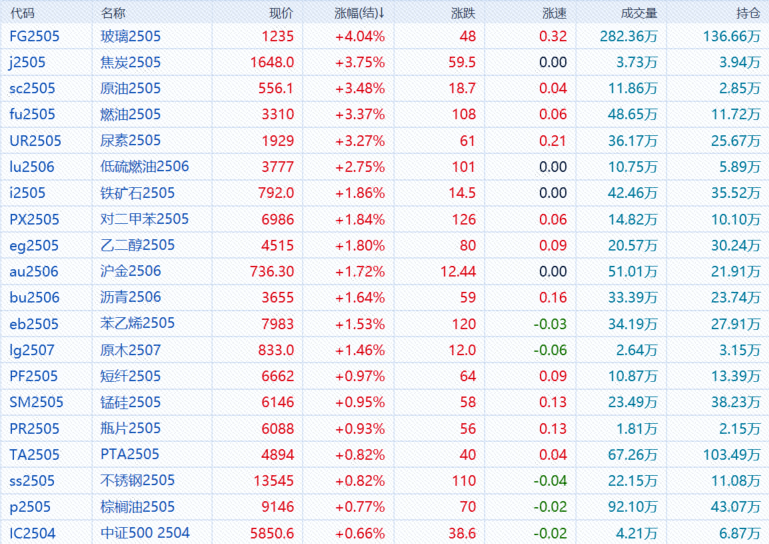 4月1日,午盘收盘,国内期货主力合约涨跌互现,菜粕跌超2%,烧碱、纸浆跌超1%,氧化铝、豆二、豆粕、豆油、甲醇跌近1%。涨幅方面,玻璃涨超4%,焦炭、SC原油、燃料油、尿素涨超3%。