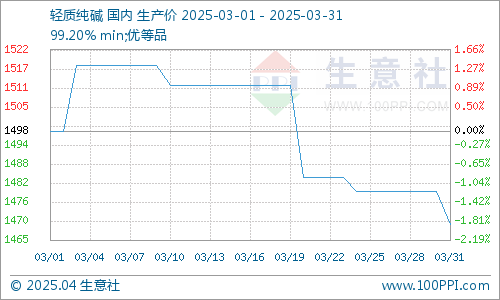 据生意社商品分析系统显示,3月纯碱价格先涨后跌。月初轻质纯碱月初市场均价为1498元/吨,月末市场均价1470元/吨左右,月内价格下调28元/吨,整体跌幅1.87%。2025年3月31日氯碱产业价格涨跌榜中上涨的商品共0种,下跌的商品共4种,涨跌为0的商品共2种。下跌的主要商品有:片碱(-0.90%)、小苏打(-0.79%)、轻质纯碱(-0.68%)。本日均涨跌幅为-0.5%。