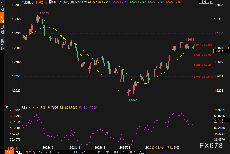 支撑方面:20日均线(1.2890)与61.8%斐波那契回撤位(1.2930)构成短期防线。若失守,50%回撤位1.2770及38.2%位1.2615将转为中期支撑。