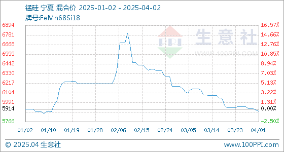 4月2日,生意社锰硅基准价为5890.00元/吨,与本月初(5900.00元/吨)相比,下降了-0.17%。