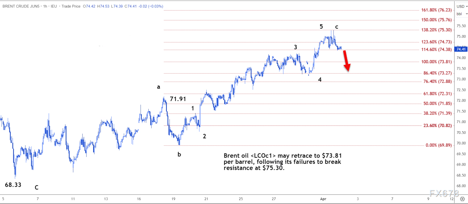 分析师指出,布伦特原油未能突破每桶75.30美元的阻力位,可能回撤至每桶73.81美元。