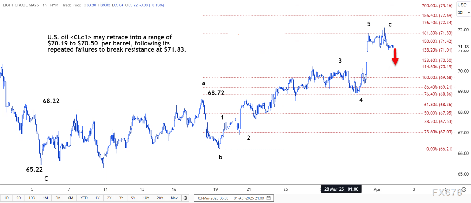 分析师指出,美国原油价格多次未能突破71.83美元的阻力位,之后可能回撤至每桶70.19至70.50美元的区间。