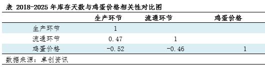 根据对近十年数据分析发现,鸡蛋库存天数与价格呈现中度负相关关系,生产、流通环节库存天数与鸡蛋价格相关性系数分别为-0.52、-0.46。即当库存天数越大,多反映市场出货不顺畅,供大于求增加,鸡蛋价格存在回落预期;反之,库存天数减少,市场供不应求,鸡蛋价格存在上涨可能。