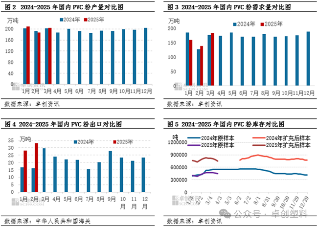 出口较为活跃,出口量明显增加。一季度是海外的需求旺季,也是中国PVC粉的出口旺季,今年一季度国内PVC粉价格处于历史低位,出口价格优势明显,出口量也出现明显的放量。据海关统计数据显示,1-2月份PVC粉出口量60.998万吨,同比增加85.36%,3月份出口预计仍将维持高位。出口是PVC粉基本面为数不多的利多因素。