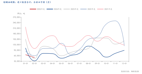 2025年1月中国棕榈硬脂进口量6.51万吨,环比减少26.8%,同比减少35.96%。1-2月累计进口量11.48万吨,同比减少13.67%。