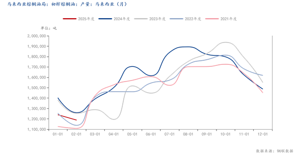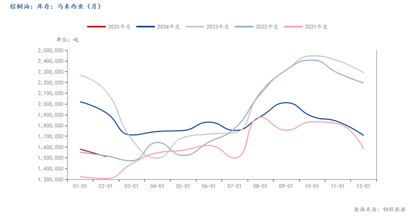 (2)马来西亚棕榈油库存处于较低水平。钢联数据显示,2025年2月马来西亚棕榈库存为151.2万吨,环比降低6.8万吨,降幅4.3%,同比减少40.8万吨,降幅21.25%。1-2月累计库存同比处于低位水平。
