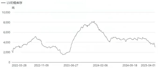 2025年以来海外LME锡库存持续下行,截止4月1日为3050吨,上周国内锡锭社会库存为11482吨,较前一周增加934吨。