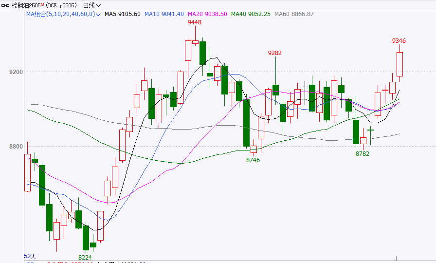 因生柴需求旺盛,4月2日棕榈油主力2505合约继续震荡上行,形成六连涨行情。截止今日收盘报9304元/吨,日涨186元/吨,涨幅2.04%。