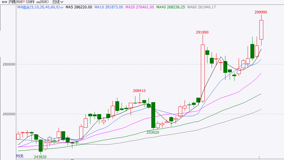 4月2日沪锡主力2505合约盘中大幅上行,逼近30万大关,截止下午收盘报297590,涨幅3.89%。