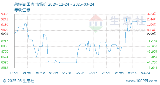 3月24日生意社菜籽油基准价为9211.67元/吨