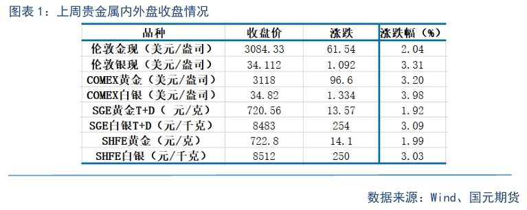 上周黄金价格继续强势上行,国际金价站上3000美元关口后持续上涨至3085美元/盎司,再创历史新高。市场对美国即将于4月2日宣布的关税政策担忧,助推市场避险情绪。上周欧美股市普跌也有利于贵金属避险买需。预计后续市场出现波动且多空博弈增加。