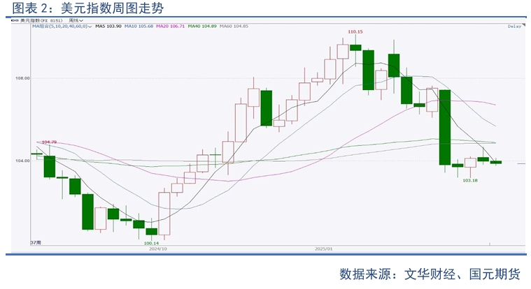 小幅反弹后,美元指数再度迎来下跌。美元指数在周一至周三震荡上行,且周周三一度冲过20日均线后,周四周五震荡回落,再度回到20日均线以内,周五收盘于104.0120,全周累计微跌0.14%。
