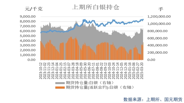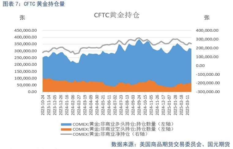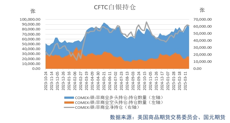 截止3月25日的周度统计周期中,黄金非商业多头持仓为316572张,较上周减少5082张,非商业空头持仓为66776张,较上周增加3054张,基金净持仓减少8136张,多头离场,空头进场,多头持仓变化更大。截止3月25日的周度统计周期中,白银非商业多头持仓为85712张,较上周减少1889张,非商业空头持仓为24762张,较上周减少541张,基金净持仓减少1348张,多头空头均有离场,多头持仓变化更大。