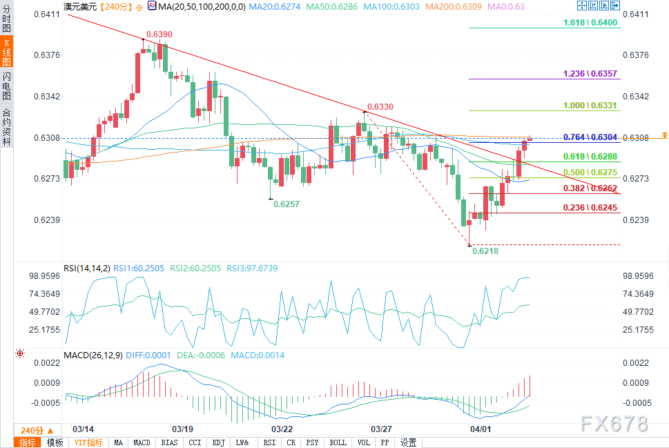 汇通财经APP讯——周三(4月2日)欧盘时段,澳元/美元盘中小幅震荡上涨,澳元/美元连续第二个交易日吸引了部分跟风买盘,从周一触及的近四周低点(约澳洲联储0.6220澳洲联储-澳洲联储0.6215澳洲联储区间)进一步回升。这一涨势在欧洲时段早盘将汇价推升至周内高点,多头目前正寻求在突破澳洲联储0.6300澳洲联储整数关口的基础上进一步扩大涨势。