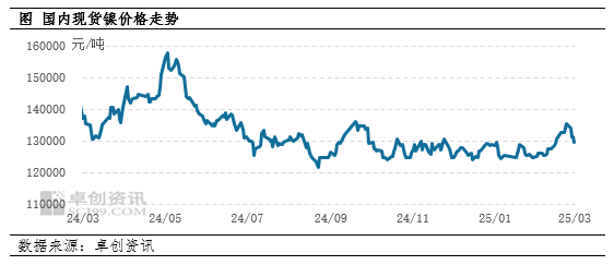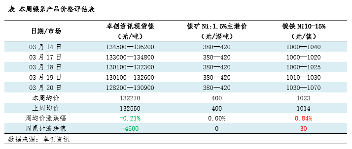 现货镍价高位回落,临近周末成交稍有好转。截至3月20日,国内现货镍价格129550元/吨,较上期下跌4500元/吨,跌幅为3.36%。从均价角度来看,本周现货镍均价为132270元/吨,较上期下跌280元/吨,跌幅为0.21%。本周镍价震荡下跌,主要是因为:第一,消息面存支撑,但市场看涨情绪降温,仅有印尼新政带动,现货市场暂无明显反应,价格上行乏力;第二,下游不锈钢成交不及上周,需求减弱施压镍价,最终现货镍价高位回落表现不佳。