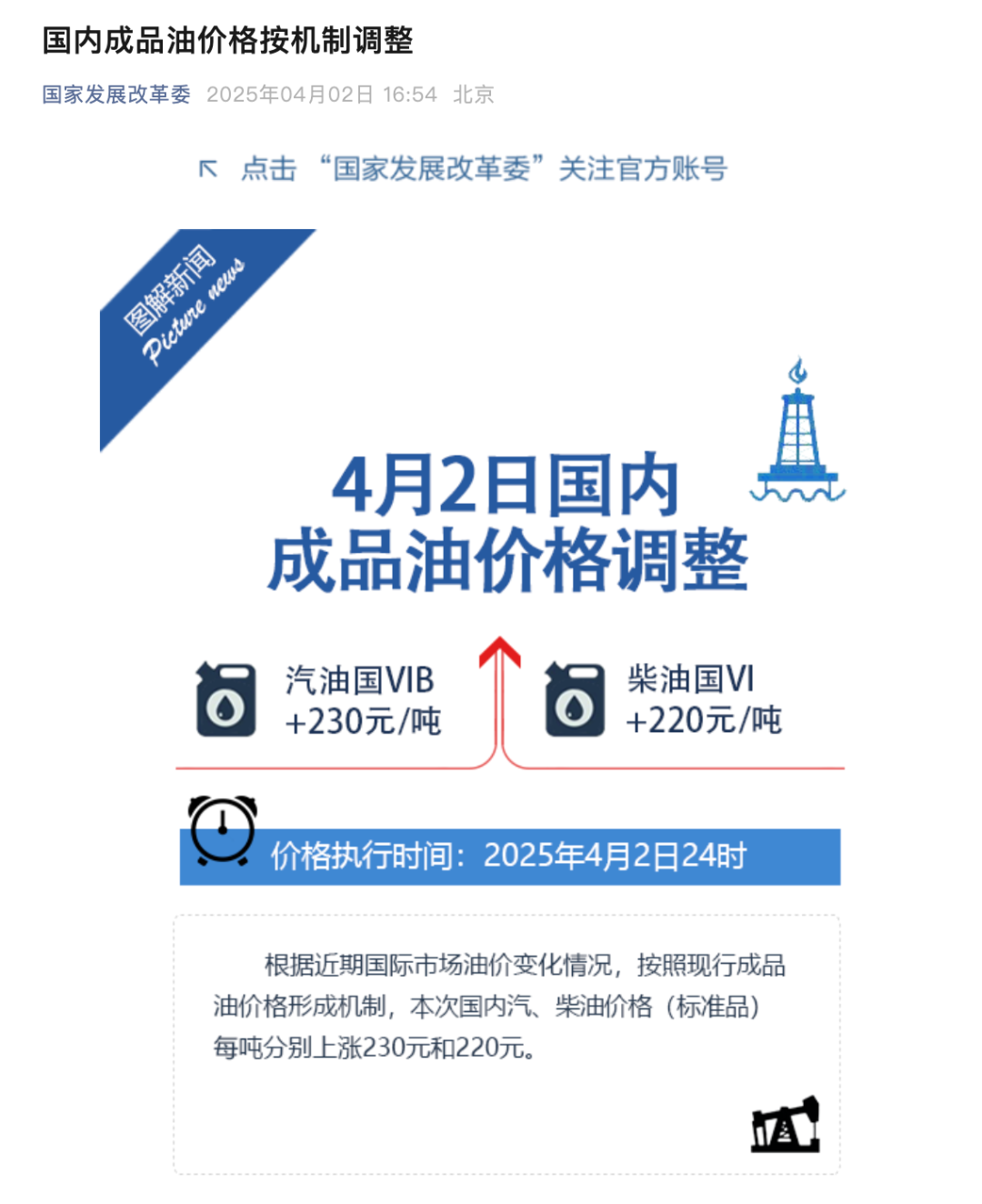 4月2日,国家发展改革委发布消息称,根据近期国际市场油价变化情况,按照现行成品油价格形成机制,自2025年4月2日24时起,国内汽、柴油价格每吨分别上涨230元、220元。