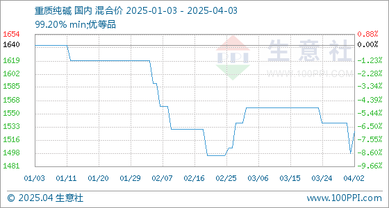 4月3日生意社重质纯碱基准价为1527.50元/吨
