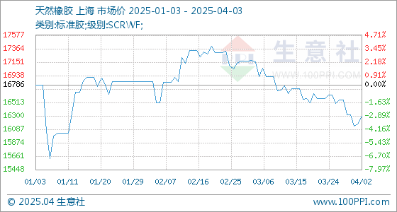 4月3日,生意社天然橡胶基准价为16297.00元/吨,与本月初(16138.00元/吨)相比,上涨了0.99%。