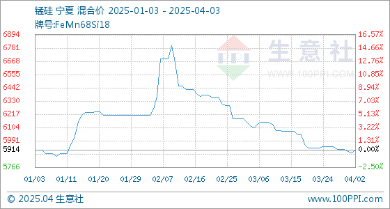 4月3日,生意社锰硅基准价为5910.00元/吨,与本月初(5900.00元/吨)相比,上涨了0.17%。